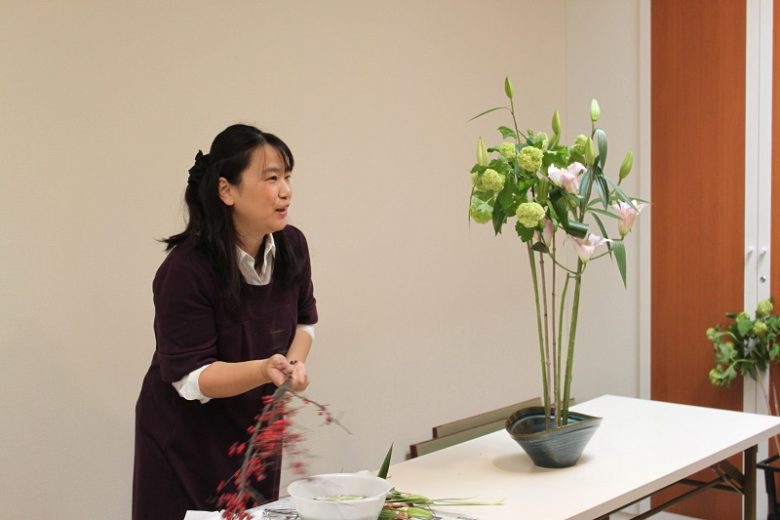 剣山と水盤を使って、自由にいけていただきます。草月のいけばなの観点から、アドバイスします。